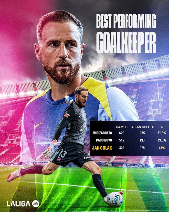 奧布拉克目前西甲聯(lián)賽共出戰(zhàn)379場,送出178場零封,零封率高達(dá)47%。